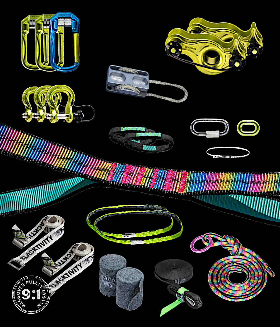 The set also includes Connection Loops, Tree Protectors, a Dyneema sling, an 8mm Quicklink and a backpack.